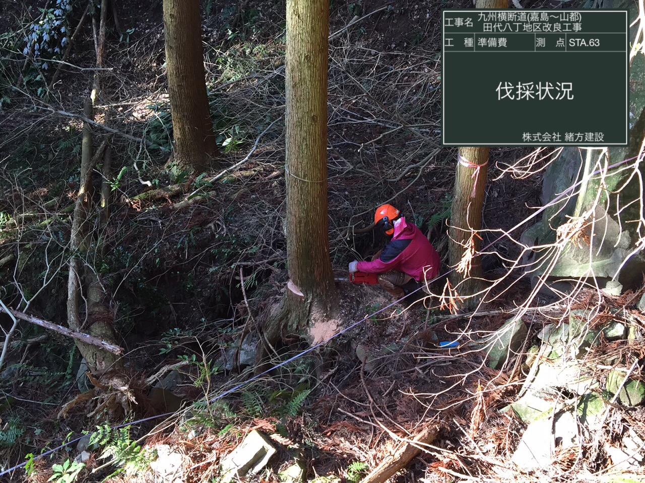 現在、先行伐採中です。 事前に伐採しておくことで、 樹木を乾燥させ、軽くすることで 取り扱いやすくする工夫です。