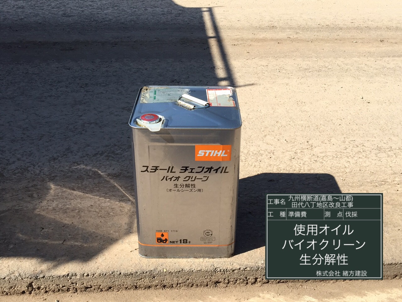 伐採工事では、環境影響リスク低減対策として、 植物性油脂を主成分とした、 生分解性のチェンソーオイルを使用しています。