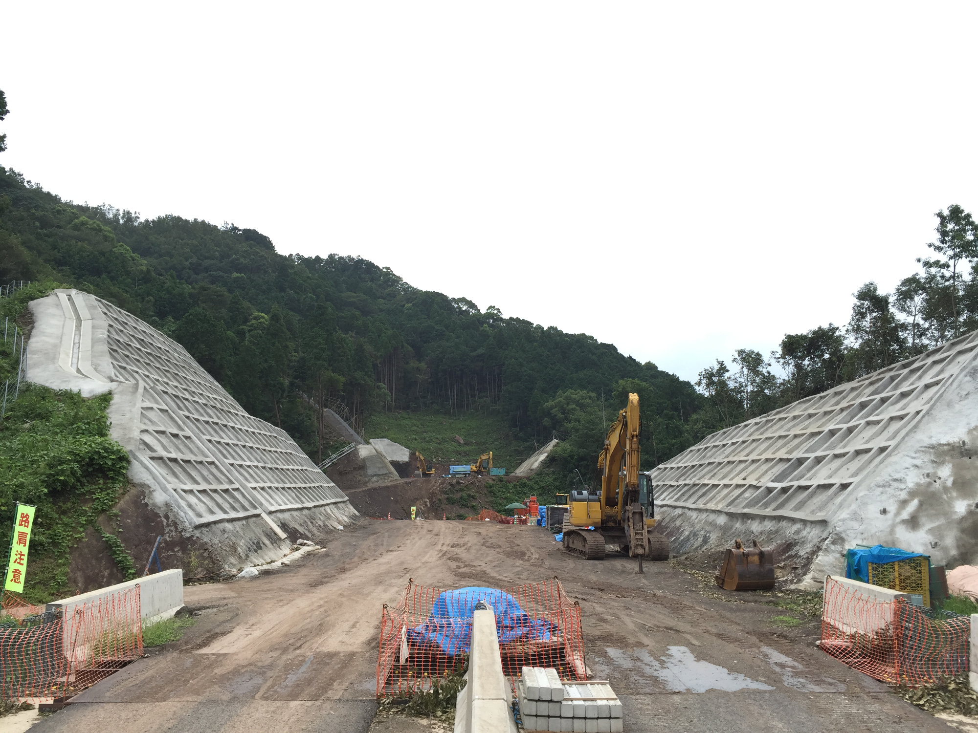 8月の進捗写真. Tweet Pocket 8月の進捗写真を投稿します. 8月は中間尾根部分の逆巻施工を進めてきました. 逆巻1回目掘削・鉄筋挿入工、2回目掘削を完了し、 現在2回目鉄筋挿入工を施工中です. あと、八丁第1橋・第2橋間の拡幅工事として、 多数アンカー式補強土壁工の施工を始めました. 9月は逆巻3回目の掘削・鉄筋挿入工・トンネル坑口盛土を 進めて、大まかの目処をつけれるべく頑張ります. 併せて、拡幅工事も進めていき、田代第2トンネルの施工を見据えて 道路整備を行っていきます. 起点から望む. Tweet Pocket